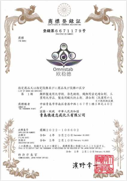 2023年2月10日,青岛德达特化集团顺利完成“欧稳德 OMNISTAB”商标在日本地区的注册。目前,商标已通过日本当地商标局核准,并成功获得“日本商标注册证书”,证书有效期为2023年2月10日至2033年2月9日。