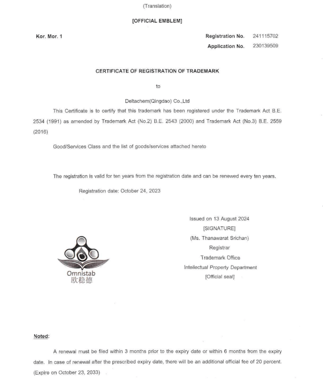 近日,青岛德达特化集团顺利完成“欧稳德 OMNISTAB”商标在泰国地区的注册。目前,商标已通过泰国当地商标局核准,并成功获得“商标注册证书”,证书有效期为2024年10月24日至2033年10月23日。