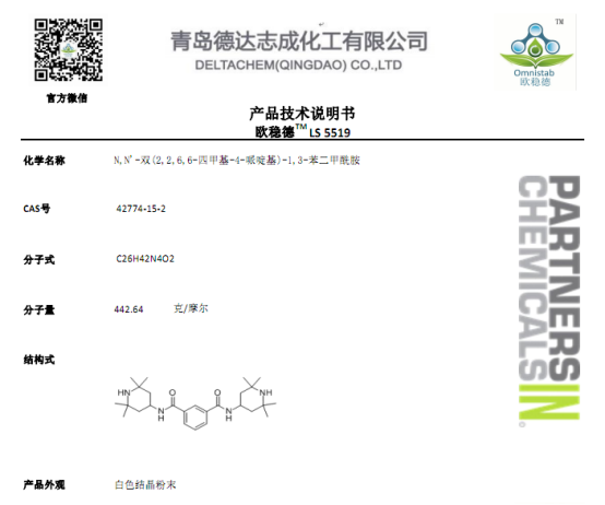 OMNISTAB LS5519 是德达特化集团近期推出的一款高效尼龙光稳定剂,该产品为白色结晶粉末,与克莱恩的Nylostab S-EED产品100%一致,是一款特别适用于尼龙材料的多功能稳定剂。