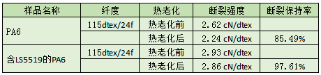 PA6热老化后的断裂强度降低了0.38 cN/dtex,说明尼龙材料对于热的抵抗力很差,而含有LS5519的PA6热老化后的断裂强度降低了0.07cN/dtex,说明LS5519可以显著提高尼龙材料的抗热老化能力,PA6的断裂保持率为85.49%,而含有LS5519的PA6断裂保持率为97.61%,由此可见LS5519能够提高尼龙材料的抗断裂性能。
