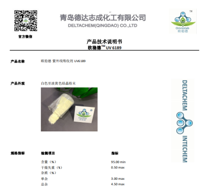 欧稳德®UV6189是一种高效紫外线吸收剂,外观为淡黄色粉末。它不仅能够抵抗全波段的UVA射线,作为该产品的特色之一,它还能够有效吸收360-370nm的紫外光。基于UV6189优异的紫外线吸收能力,作为高效的宽光谱油溶性UVA滤光剂,可以广泛应用于丙烯酸压敏胶、化妆品等产品中,特别适用于户外使用、对抗紫外线吸收要求高的产品中。
